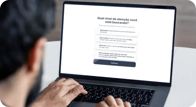 Você preenche um formulário completo, onde vou entender sua rotina, gostos, limitações, histórico, horários, restrições, objetivo e capacidade real de execução.